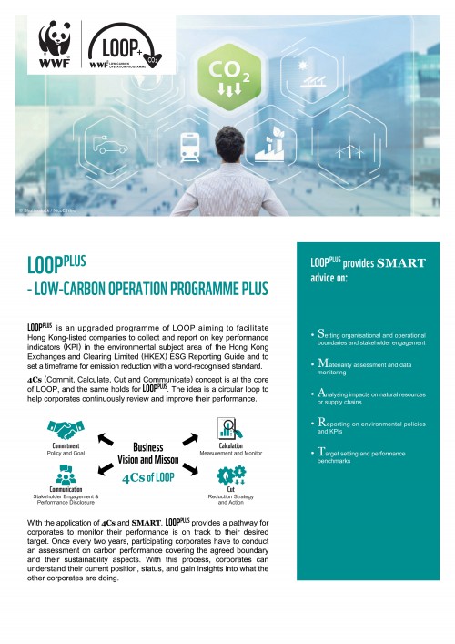 低碳營運計劃(LOOPPLUS) 是低碳辦公室計劃(LOOP)的升級企劃,旨在協助企業收集及報告與環境相關的關鍵表現指標(KPIs)及以國際公認標準訂定減排時間表。 LOOPPLUS秉持LOOP一貫的4Cs理念(承諾、計算、減少及溝通),透過進取程度(ambition-based)機制,為企業提供一個循環路徑去持續檢視及以循序漸進的方式提升營運表現,邁向淨零(Net Zero)。